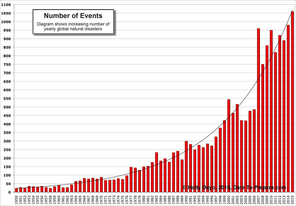 Other events besides the recent terrorist attacks are spurring prep efforts. Take a look around you. Do weather patterns seem normal? Have natural disasters receded in any manner? There's no longer a question whether or not weather has become more erratic, more severe, though the cause is hotly debated. Look at the graph above left to see how much natural disasters have escalated in the past few years and America isn't ready. Much of this escalation is due to greater energy output from the Sun. Without question, weather is wilder and more extreme than even a decade ago. While we can not control the Sun's activity and the resulting weather phenomena, we can take action to protect ourselves and our families. Christians who feel there is no need to prepare, may wish to consider these thoughts. Part of preparing is having a garden for you and your family. Garden Gold equips you with the knowledge for a superior space-saving garden wherever there's sunshine. You'll grow more fruits and veggies with less time and effort spent, yet with more taste and nutrition than you ever thought possible. It will spoil you having to eat commercial produce again! Stan and I have gardened for many years using a variety of techniques. We are convinced that biointensive gardening practiced by the ancient Chinese makes the best sense. Biointensive just means that a lot of food is grown in a small area. Garden Gold shows you how to do it with modern improvements.We've heard from many folks in these economically challenging times how glad they are to have food supplies to carry them over these bumps. Imagine if you or your spouse became ill, unable to provide an income. Wouldn't it be reassuring to have "insurance" you can eat? Wise are those that prepare ahead of time. It's more important than ever to keep emergency preparedness items on hand. This is no time to be slack. Keep stored foods rotated. If you have consumed existing supplies, be sure to replenish them. Another tool you might find useful in your preparedness efforts is Prudent Places USA. Not only is Prudent Places USA an excellent relocation tool, it helps you better understand the strengths and weaknesses of your current location.Unlike Dare to Prepare, Prudent Places USA addresses issues only for America. It's filled with over 550 high resolution, full color, large maps that show details down to a county level - all 3,143 of them! Covered are 64 in-depth topics in the areas of: